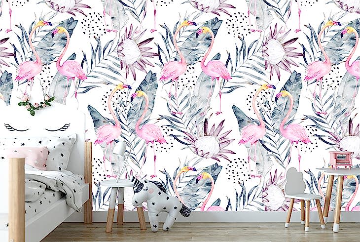 Flamingo desenli duvar kağıdı sevimli ve eğlenceli bir seçenek olabilir, çocuk odalarını renklendirir.
